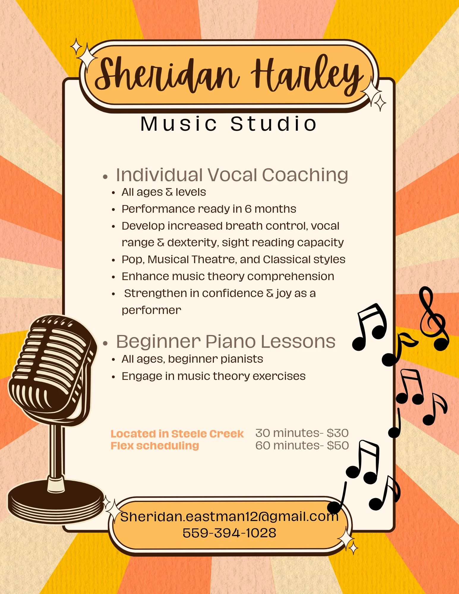 Email, text, or call me to set up a lesson! Scheduling is flexible, so don’t worry about comitting to the same day each week. We’ll be in touch soon!
